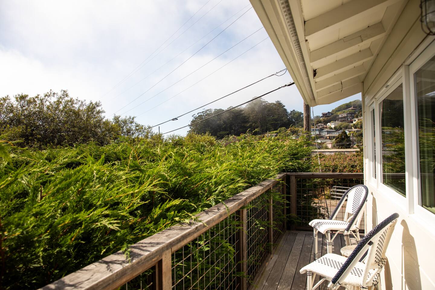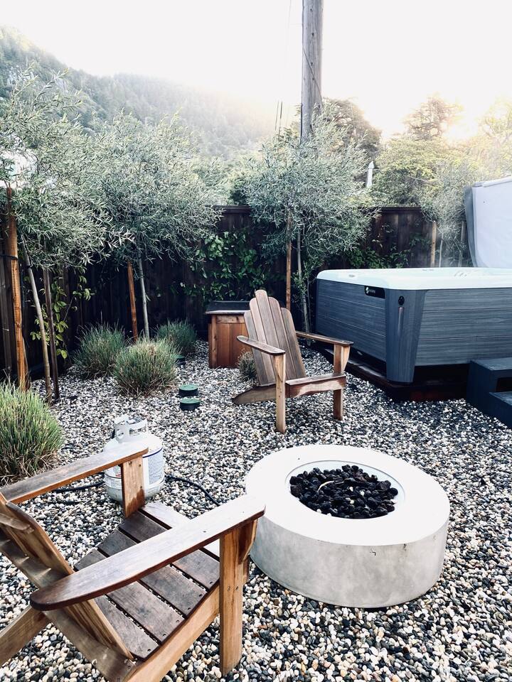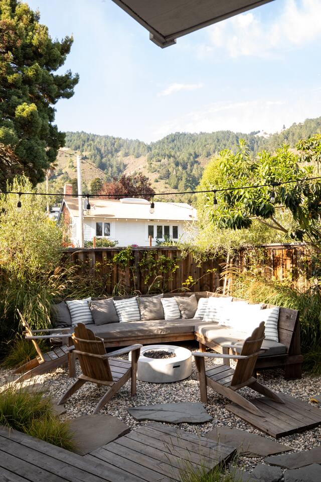 Guests will enjoy ocean and mountain views, a wraparound deck, private gardens, outdoor showers, firepits, and a hot tub—perfect for unwinding after time in nature. With comfortable, thoughtfully appointed interiors and a location just minutes from the sand and the trails of Mount Tamalpais, the home provides a serene, elegant backdrop for a deeply restorative